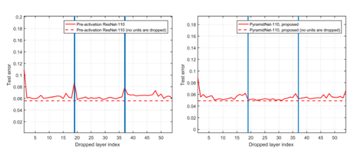 - 좌측 그림이 ResNet이며, 우측 그림이 PyramidNet이다. 파란색 선이 downsampling이 일어나는 layer이다. 그림에서 처럼 좌측 ResNet의 downsampling시점에 성능이 급격하게 저하되는 것을 확인할 수 있다. 대조적으로 우측 pyramidnet은 모든 layer에서 성능저하가 동일하다.