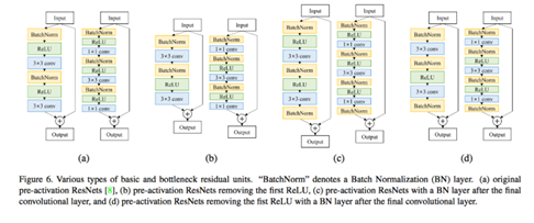 - 또한 본 논문에서는 Residual block안에 ReLU가 많으면 성능저하를 만들며, 그림 3의 (b), (d)와 같이 첫 번째 ReLU를 제거했다. 또한 이렇게 첫 ReLU를 제거하면 두 conv layer 사이에 non-linearity가 사라져서 representation power가 약해질수 있으므로 bathnormalization layer를 하나 더 추가했다. 이는 그림 3의 (d)를 통해 확인할 수 있다.