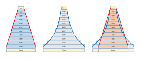 - 그림 2의 가운데와 우측 그림과 같이 PyramidNet에서 layer의 width를 넓히는 방식은 2가지가 있다. 첫 번째는 가운데 그림과 같이 multiplicative 방식으로 지수배로 늘린다. 두 번째는 우측 그림으로 additive 방식으로 전체 layer에서 얼마나 width를 늘릴지 a를 정하고, 이전 width에 비해 a/N만큼 늘린다. N은 residual block의 개수이다.