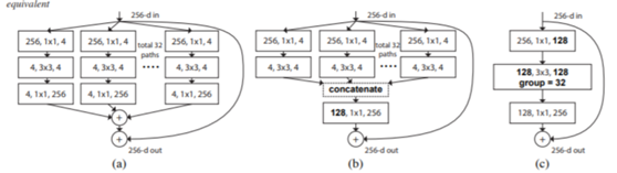 - 그림 2와 같이 3가지 ResNeXt 모델을 제안했다. ResNeXt의 residual block은 모든 block이 각 path마다 동일한 구조를 가지고 dimension이 모두 동일하기 때문에 사용하기 편리하다는 장점 또한 가진다.