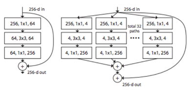 - 그림 1의 좌측이 ResNet이며 우측이 ResNeXt이다. 그림에서 처럼 residual block이 여러 개 인 것을 확인할 수 있다.