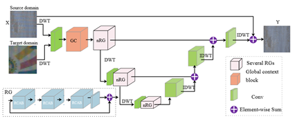 -Feature mapping in wavelet domain, 제안하는 기법에는 DWT, IDWT opertation을 이용하여 feature를 downsampling, upsampling한다. 이를 통해 computation complexity를 줄이고, 정보 손실을 방지하는 역할을 한다.
