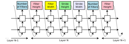 -아래와 그림과 같이 convolution layer로 구성된 네트워크를 만든다고 하면, filter의 개수나 stride 등 여러 hyper-parameter들 중에서 최고의 성능을 보이는 parameter값으로 설정하여 네트워크를 생성한다.