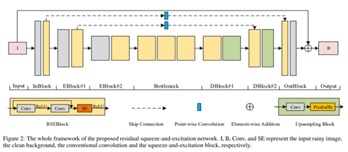 -본 논문에서는 Residual Squeeze and Excitation Network (RSEN)을 제안하여 image deraining에서 좋은 성능과 light-weight한 구조로 빠른 속도를 보여준다.