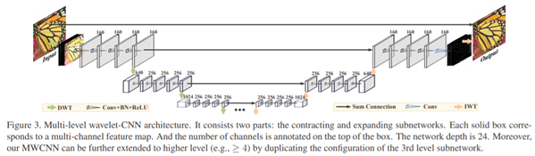 -제안하는 MWCNN은 기존 U-Net의 구조에 wavelet transform을 이용하여 feature map의 사이즈를 줄이며 subnetwork를 만들어낸다. DWT는 invertible하기 때문에 downsampling으로 이용해도 information을 유지할 수 있다. 더불어 DWT를 통해 feature map의 frequency와 location information을 모두 capture할 수 있기 때문에 detail texture또한 보존이 가능하다.