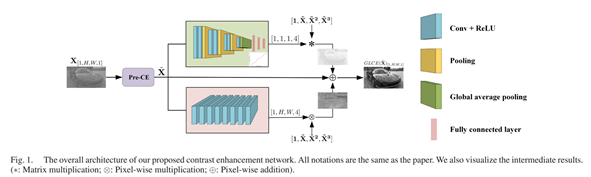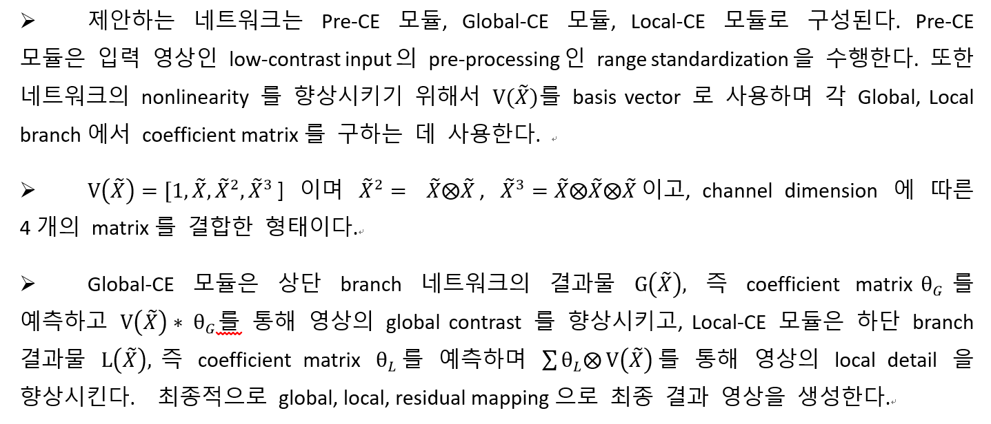 -본 논문에서는 단일 영상 대비 향상을 위한 CNN 기반 네트워크를 제안하며, 기존의 CNN 기법들이 가장 기본적인 convolutional operation이나 영상의 local feature만 탐색하는 제한적인 방식에서 벗어나, 2가지 parallel branch를 통해 한 가지는 global contrast를 향상시키기 위해 global transformation curve를 재구성하고, 다른 한가지는 local detail를 복원하기 위해 pixel offset을 directly predict한다.